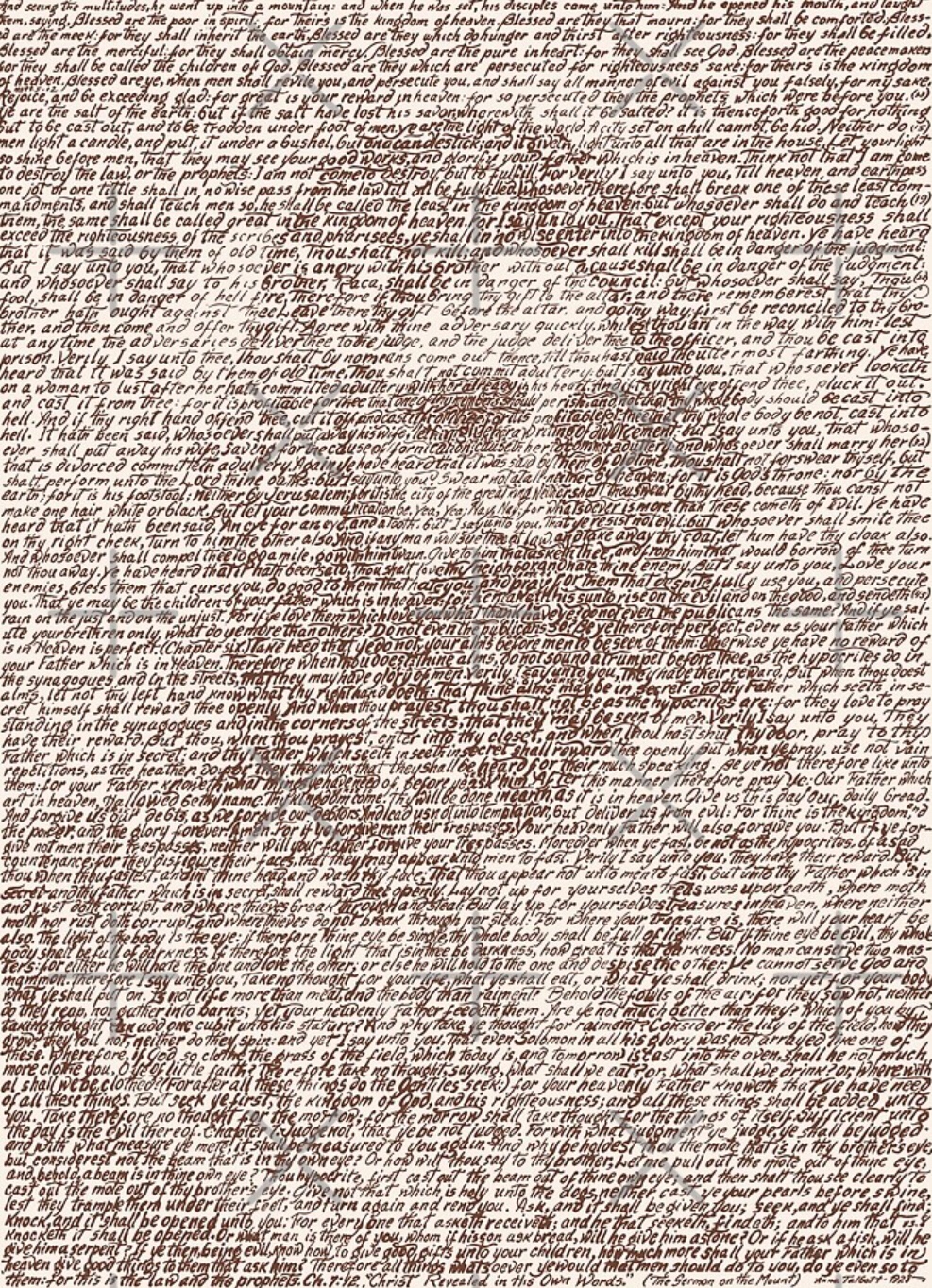 About forty years ago I saw a “poster art” portrait. It was constructed using the words of the Sermon on the Mount. The letters and words were legible, but the script was expanded/ contracted, boldface/italics, straight/wavy, all printed so that the message – when viewed from a few feet away – appeared as a picture of a man.
